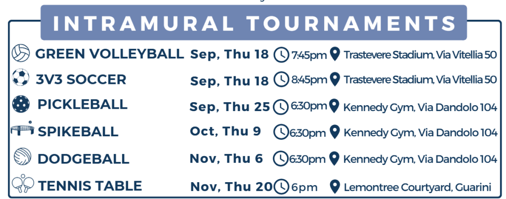 This Fall 2025 semester we organize the following intramural tournaments and pick-up games. You can book your activity here.